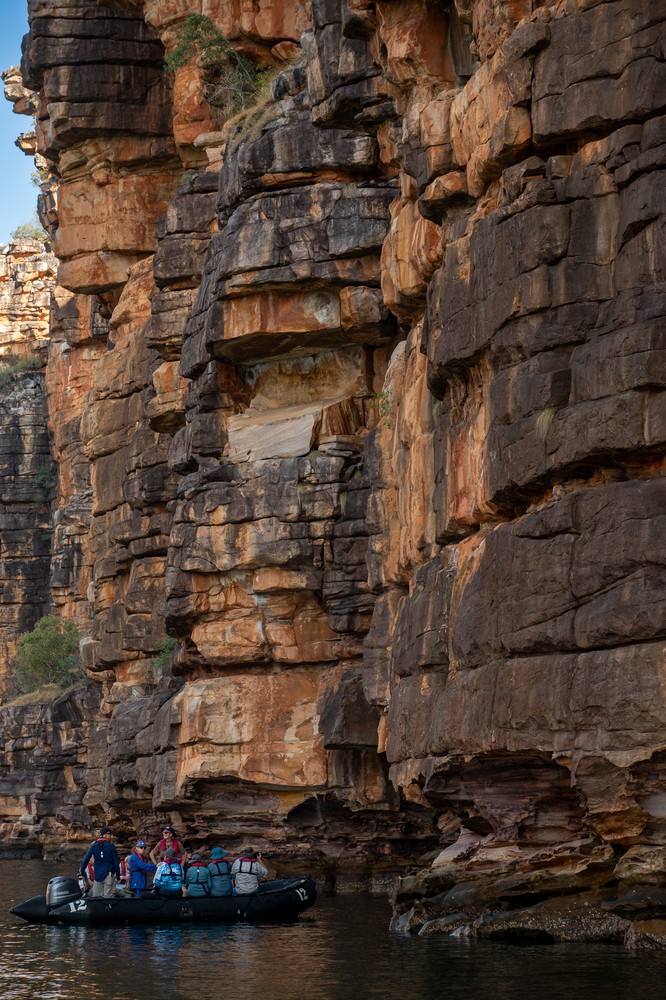 Our approach to King George River gorge is not to be missed and best experienced out on the Observation Deck as the towering 2,000 million-year-old Warton sandstone cliffs dwarf our vessel. Navigating this scenic stretch of water by Zodiac there’s much to take in passing the ever-changing eroded rockfaces as we cruise deeper into the gorge marvelling at the untouched beauty of this iconic waterway. As we reach the end of the gorge nothing will prepare you for the grand scale spectacle of the Kimberley’s highest single-drop falls as the King George River plummets 80 metres over the edge of towering of ancient red sandstone cliffs into tidal waters. Undoubtedly one of Australia’s most awe-inspiring natural wonders, the twin falls known as male and female Rainbow Serpents or Wunkurr by the Balanggarra people, are fed by wet season rains and rightly hold a special place in indigenous lore. While here we will learn about how this natural wonder was created and enjoy a closer look.