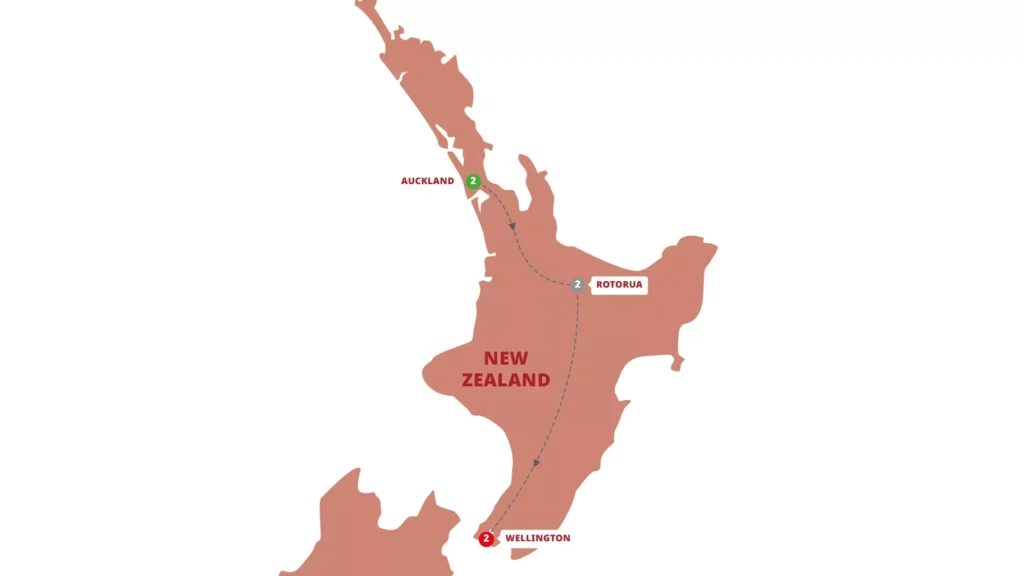 - Sightseeing across New Zealand’s North Island including Auckland, Rotorua and Wellington