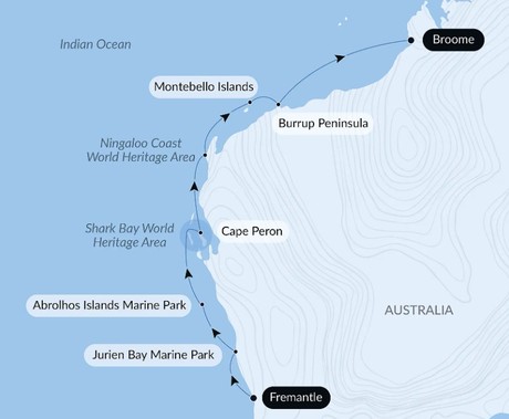 Set sail on a breathtaking expedition along Australia’s remote and rugged west coast, from Fremantle to Broome. Experience pristine beaches, turquoise waters, and striking landscapes as you explore the Abrolhos Islands, Ningaloo Reef, and Shark Bay—UNESCO World Heritage treasures. Encounter diverse marine life, dramatic coastal cliffs, and cultural connections with Indigenous heritage on this unforgettable small-ship journey.